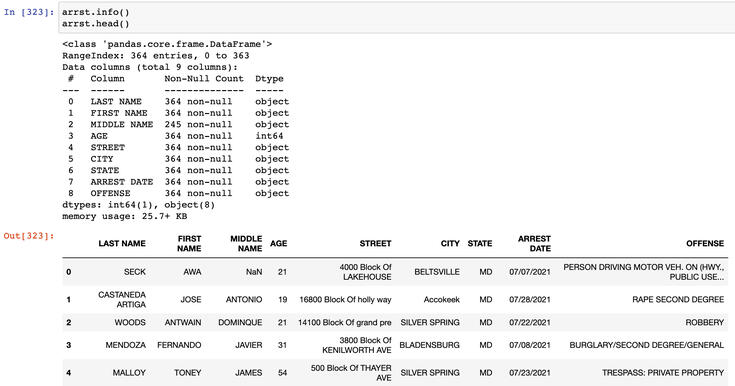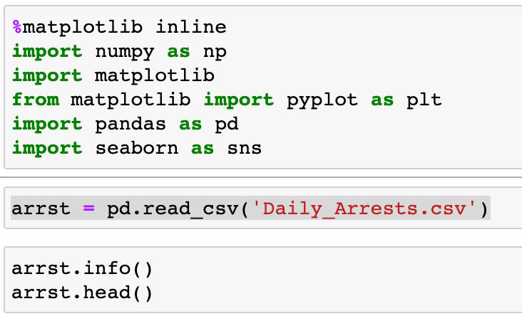>>> arrst = pd.readcsv('DailyArrests.csv')Let's see what we're looking at: