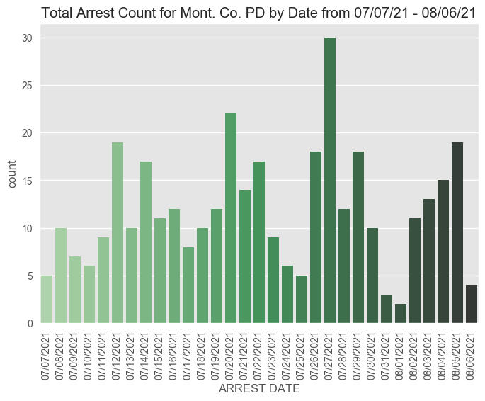 >>> plt.title("Total Arrest Count for Mont. Co. PD by Date from 07/07/21 - 08/06/21")