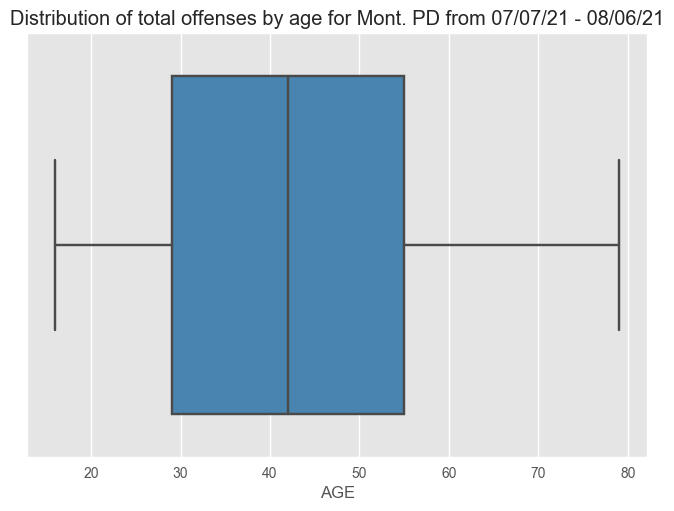 >>> plt.title('Distribution of total offenses by age for Mont. PD from 07/07/21 - 08/06/21')