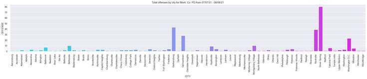 >>> plt.title('Total offenses by city for Mont. Co. PD from 07/07/21 - 08/06/21')