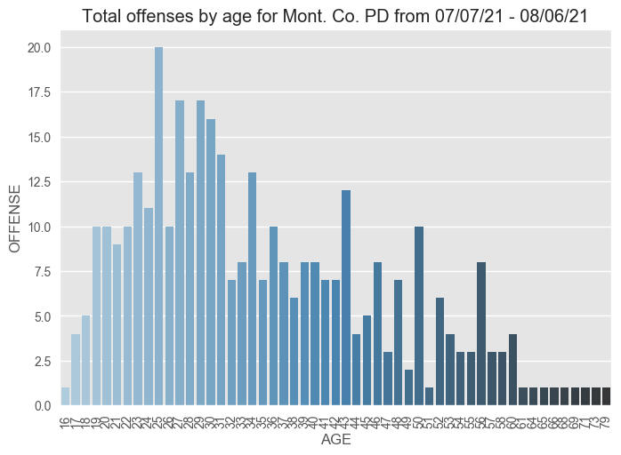 >>> plt.title('Total offenses by age for Mont. Co. PD from 07/07/21 - 08/06/21')
